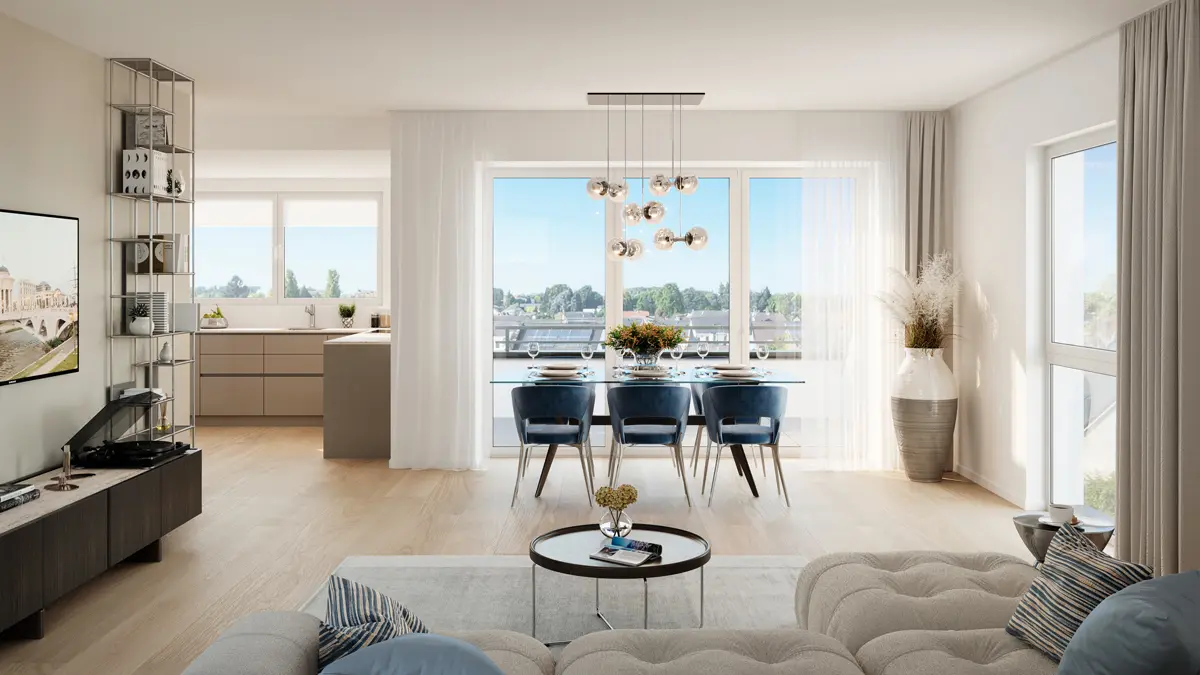 Die hellen Wohnungen sind nach Südwesten ausgerichtet, die Wohn- Essräume mit angrenzenden Terrassen und Balkonen sind zur sonnigen Gartenseite angeordnet. Alle Wohnungen können vom Hauseingang bequem über eine Aufzugsanlage barrierefrei erreicht werden. Aufzug vom EG bis zum Galeriegeschoss.